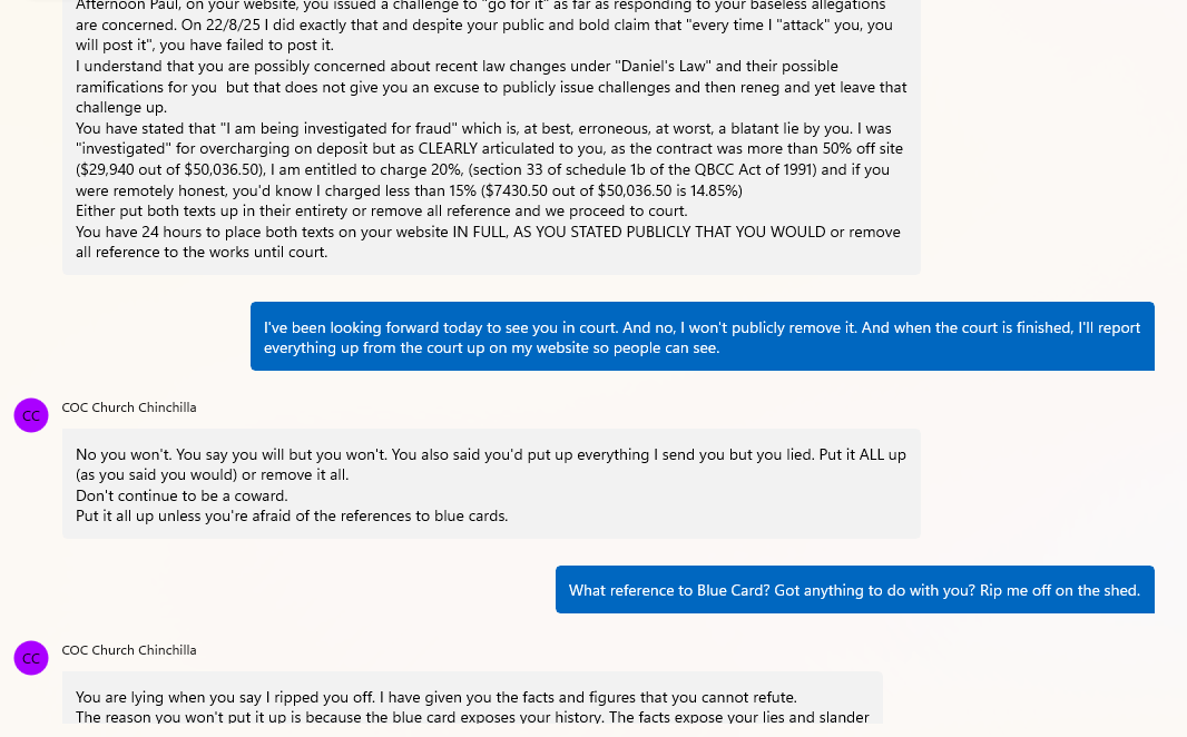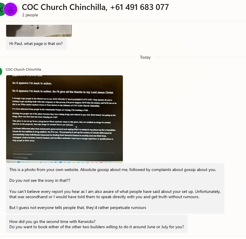 In regard to just projects. Con artist. I received a message from Messenger today to summary claims he's from some company. Referring to saying that what the evidence I'm saying is, it's all fake. I'm personally told this person go to the Queensland Government and you can see it's not fake. He has lost his license and he is being, as we speak now, investigated for fraud. Against me. For concrete, he Never done he never put in. And I got no problem just stating the fact on my website. If I knew how to put the PDF files up on my website for everybody to read, I will do it and I will get a technician to have a look at how to do this and it will be done in the next few weeks. So everybody can see efficiently what I'm talking about. But as I said, for you Tony, I know you're reading this. Just pay the money back, no problems. Then I will delete it. Until you pay the money back, I'm not deleting it. And I challenge you to take me to court. You're gutless. You're supposed to be a man of God and you do not know what the meaning of repentance is 'cause I challenged you on that Before. and you never even answered that regarding. Why have not you repented in what you've done and I'm not the only person you've done this to? You know it, I know it, and a lot of people in the community know it. and trying to attack me. Well, every time you attack me, I'm gonna put it up here on my website. So go for it