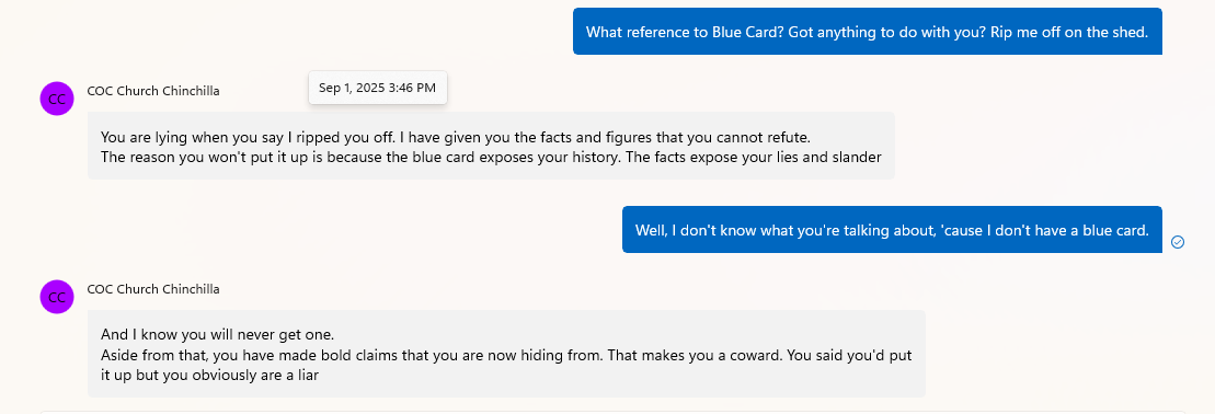 Just to point out Tony. what I've said is factual. I got nothing to hide. You want to send messages like that to me to try to intimidate me? You refuse to repent. You accused me of all my fault, cos I own the land and the rocks. under the ground. So therefore, it's my fault. I remind you; I sign a contract with you to build the shed You refuse to build the shed because you said it got rocky ground. You grew up here. I did not. You know it rocky ground in miles. you came here and assess the site beforehand. And you agreed that there's no more to pay. So, I Signed up to the contract with you & your company. and you come back to me saying It's my fault. It's all my fault because it got rock in the ground. You knew it has rock in the ground because you built the previous shed on this property for the previous owner.
